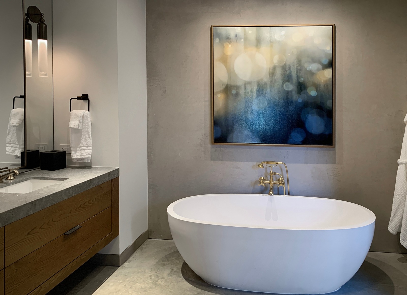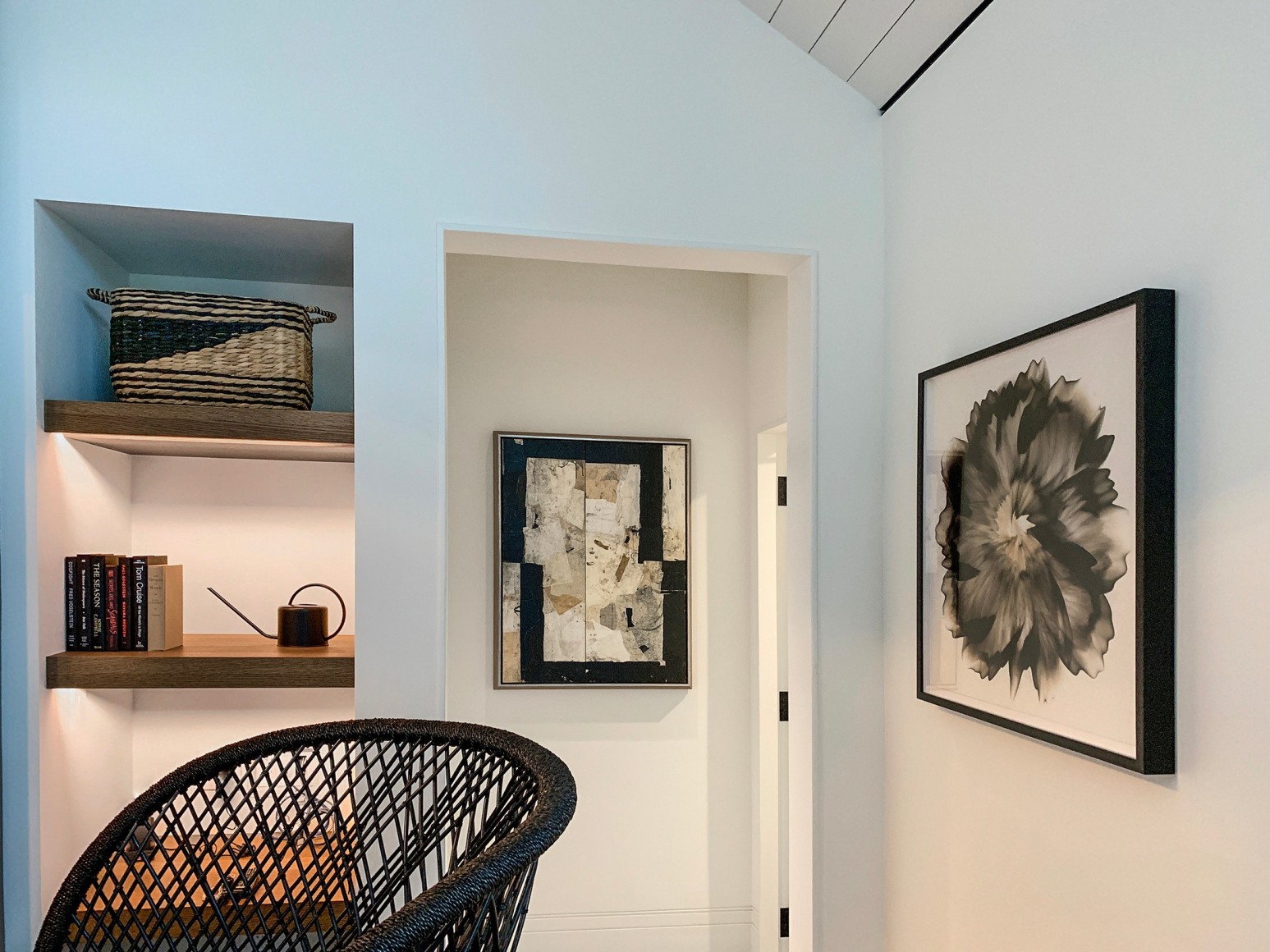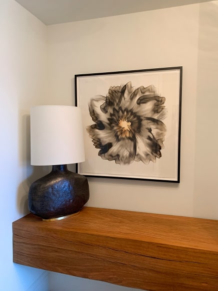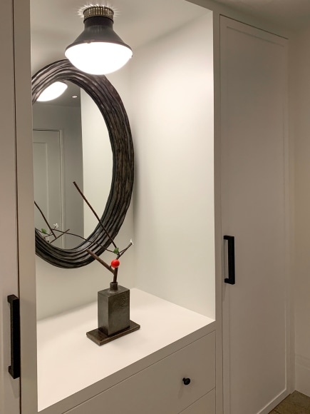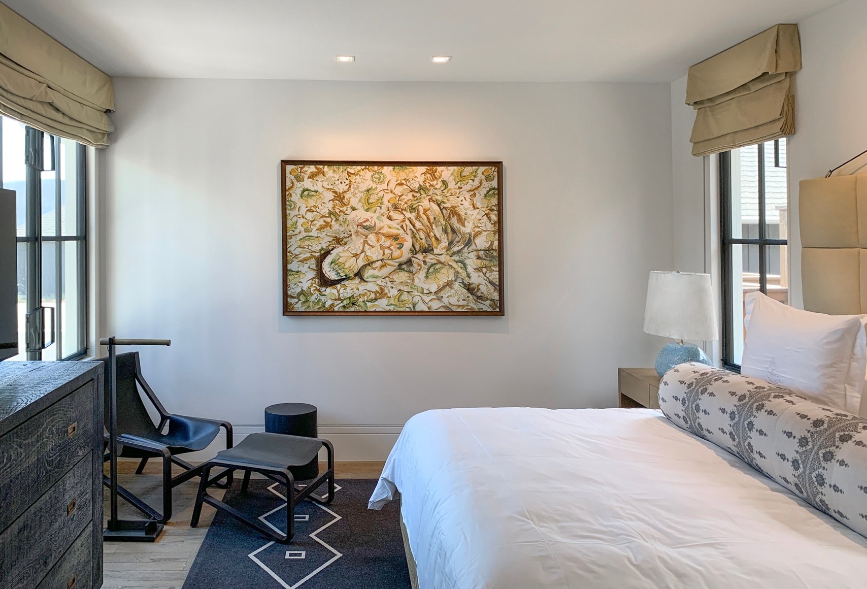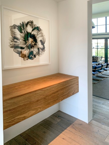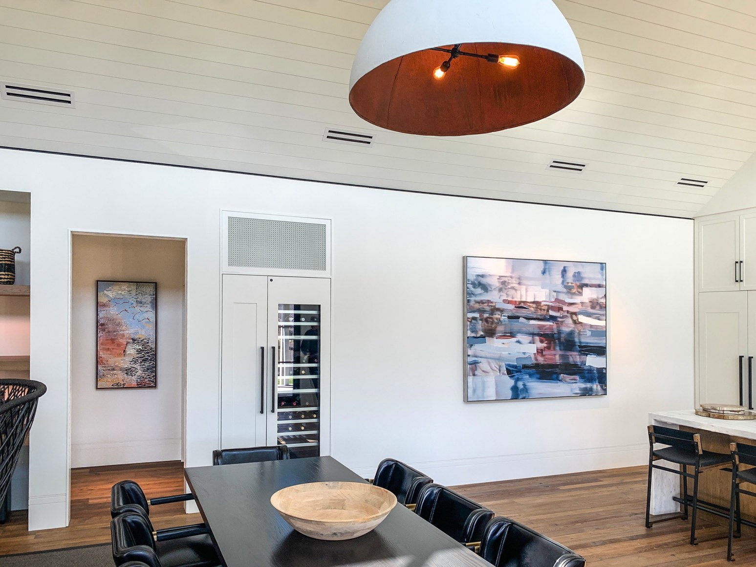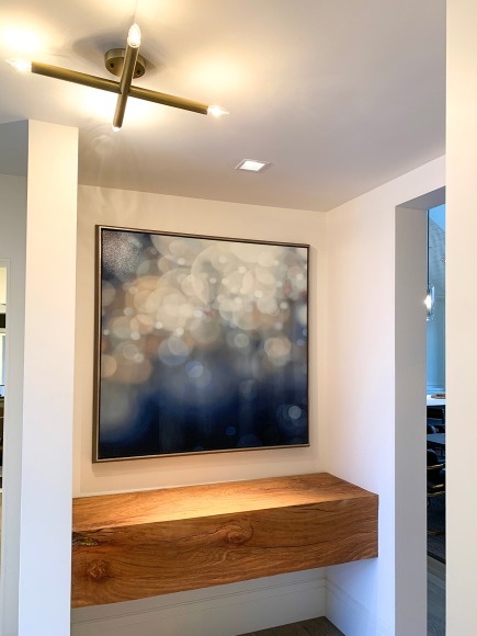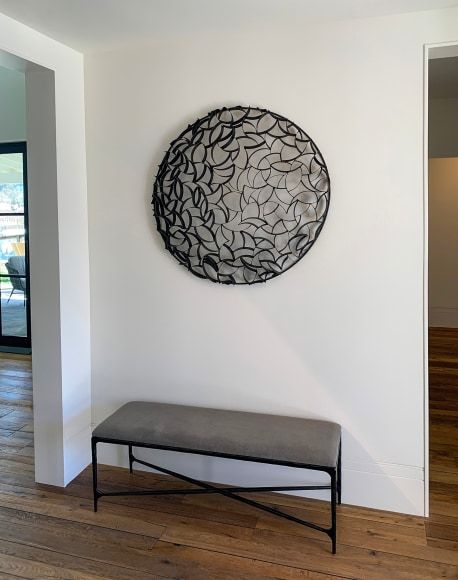on left Deborah OROPALLO, Drill Team, 51 x 81 inches (client's own), in center Stephanie WEBER, Reveal U, oil on aluminum panel, 42 x 37.5 inches, and on the right Matt DEVINE, New Light #4, black powder coated steel, 24 inch diameter x 4 inches deep