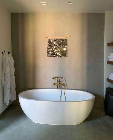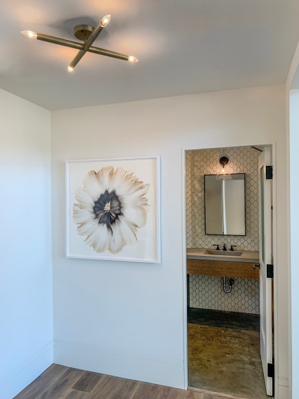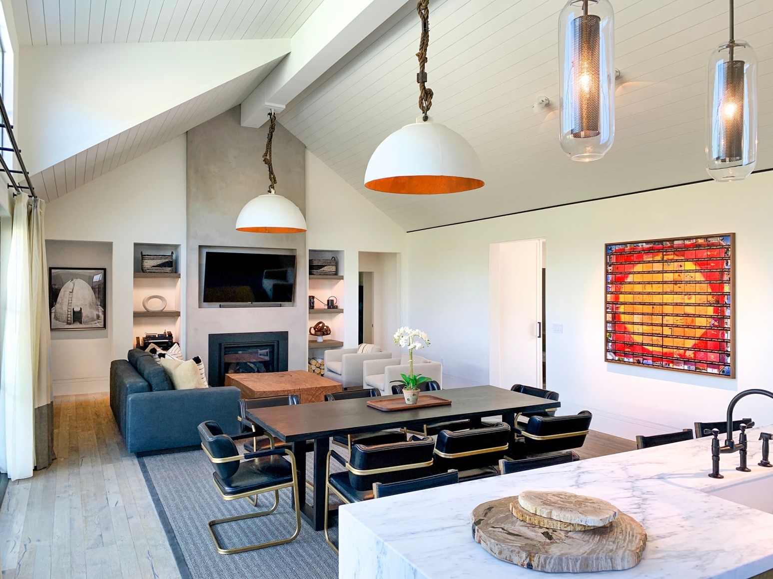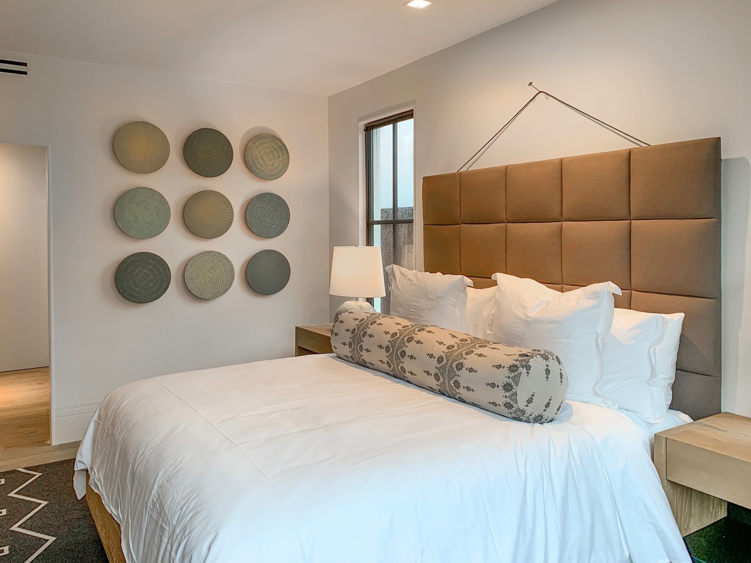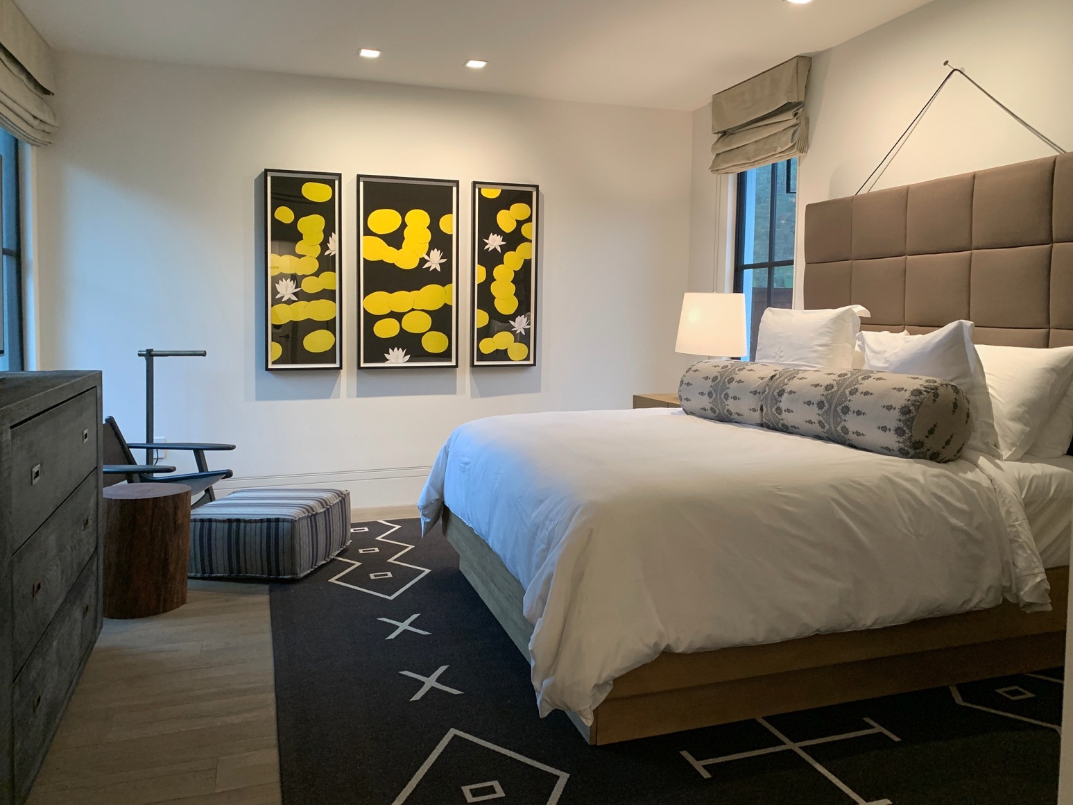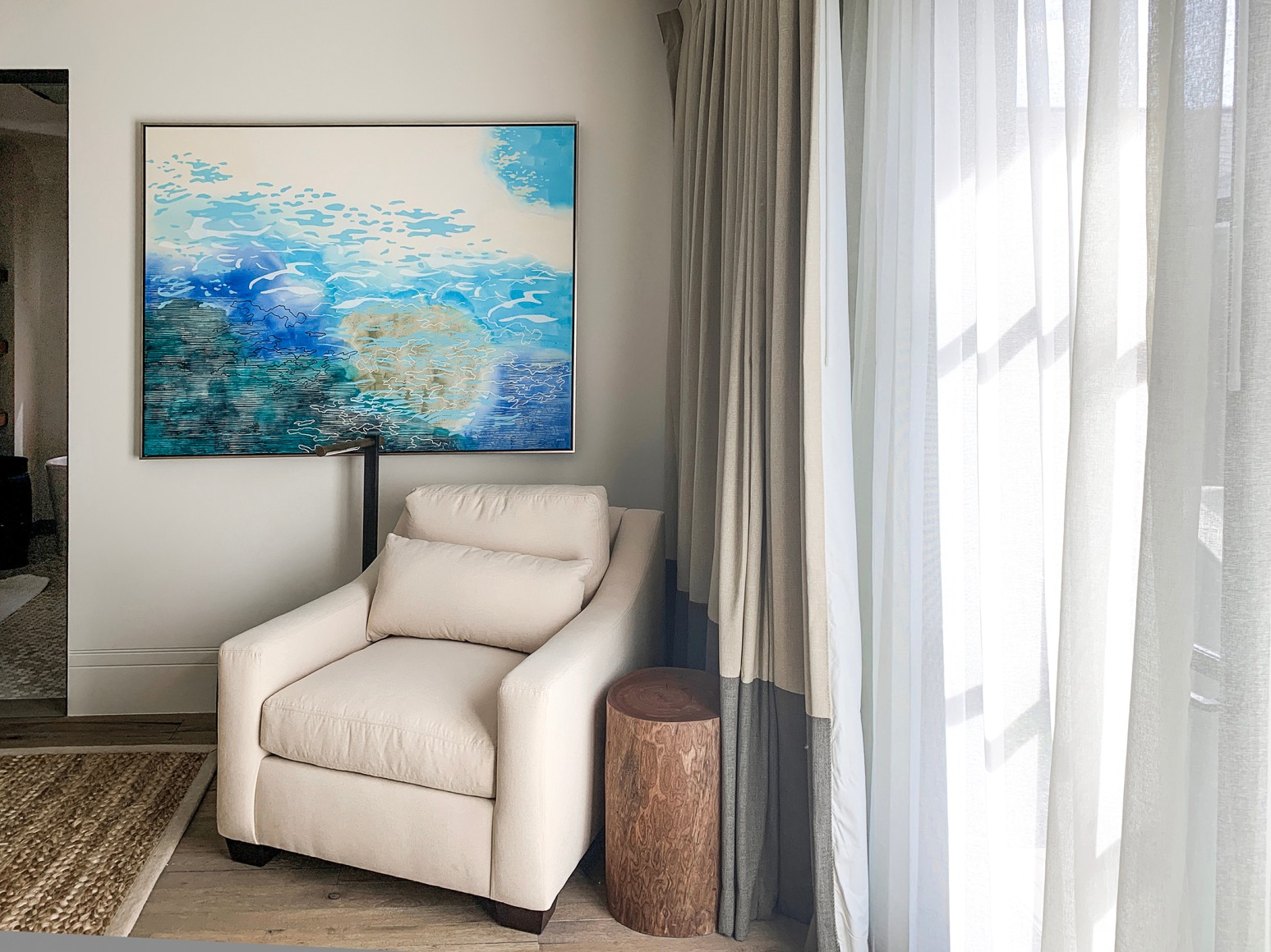 on left Deborah OROPALLO, Drill Team, 51 x 81 inches (client's own), in center Stephanie WEBER, Reveal U, oil on aluminum panel, 42 x 37.5 inches, and on the right Matt DEVINE, New Light #4, black powder coated steel, 24 inch diameter x 4 inches deep