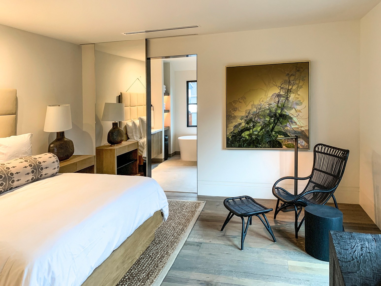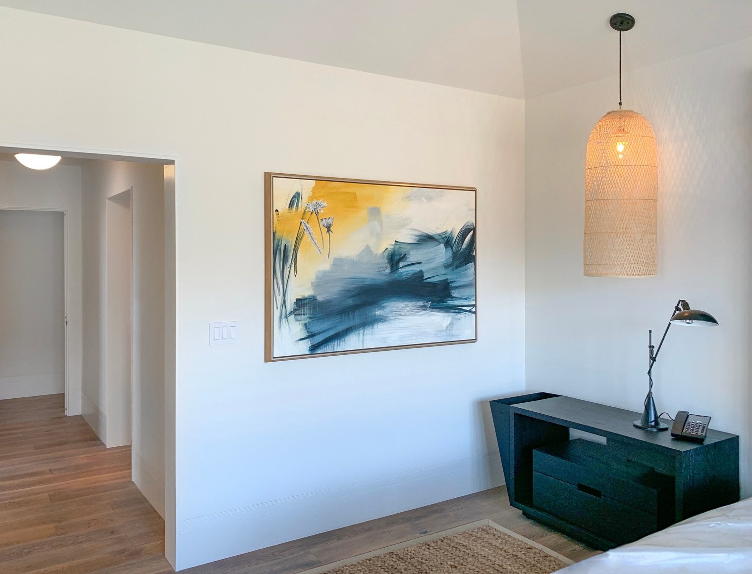 Laura FAYER, The Night We Met, acrylic and Japanese paper on canvas, 48 x 24 inches, and Ian KIMMERLY, Routines, oil on canvas, 60 x 72 inches